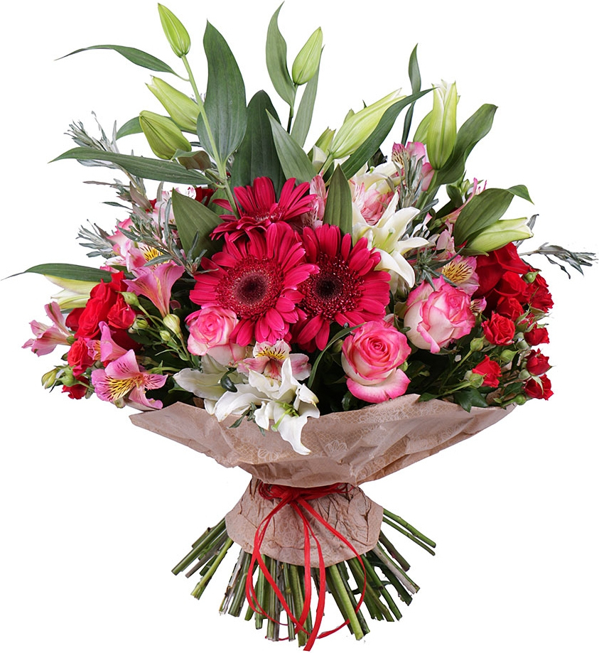 2 альстромерии, 1 розовая гербера,1 белая лилия, 3 одноголовых розы, 2 кустовых розы, зелень, упаковка, лента5 альстромерий, 5 розовых гербер,3 белых лилий, 7 одноголовых роз, 5 кустовых роз, зелень, упаковка, лента5 альстромерий, 5 розовых гербер,3 белых лилий, 7 одноголовых роз, 5 кустовых роз, зелень, упаковка, лента